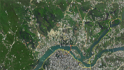 The Chaozhou section of the Han River, the yellow line for the walking route at the time and the red one for the river-crossing route
