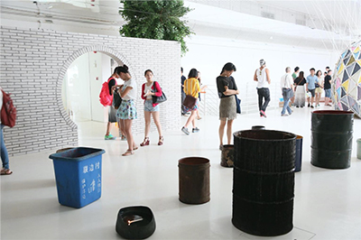 时代美术馆所处的城乡结合部有着各种肌理,城中村、杂散的工业厂房、新住宅小区、新楼盘等,大概在9年前的一次展览中,这些便成为了艺术家所共享的、可以直接取用的创作素材。大概有10多件的艺术创作被我们安放到了一个叫“美术馆街道/街市美术馆”的空间概念里,我们把所有这些取材于城市的物件,比如行道树、不锈钢4轮车,还有拱门、街巷或一些二次创作的物件等,移置到美术馆内部展厅中的一个“街道”空间。同时在展览过程中,美术馆还组织了多场公共活动,比如广场舞、集体的瑜伽课程,这些活动也直接在“街道”中进行。