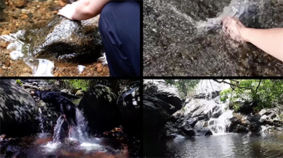 左上至右下:《洗石头》,《分水》,《瀑布》,《爬瀑布》,桂诗隽,行为影像静帧