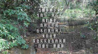 Gui Shijun, an artist in our team, is also inclined to rely back on the body and perception and to fully trust the body in her practice. As a foundation for learning about and communicating with the world, the body is both the subject and the object. When she reconnected with the world with her body, or a tool of perception, she also found a new self of hers. Li Zhengde, another participant of the program, is a conceptual photographer, who employed quotes from ancient scholars in a playful way. He found a couple of rocks in a mountain spring, drew his version of one of the Eight Scenic Spots of Wutong Mountain on a cliff, and took photos of it as a static work. Zhang Lihua, another artist, would often sit quietly at a place for observation or to draw or write something simple when she was out with us.