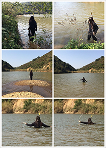 Huang Junyao: I also have a few pieces implemented in Wutong Mountain. One of them is Life, which originated from my hope to feel the undulation of flowing water at my chest as I didn’t feel good in my heart at that time, so I dry-fired the bow from the height of my heart when it was close to the surface of the water. Another one is The Appearance of Words, which is a one-minute series of action snapshots in the mountain. I was sitting on heels with most of my body hidden in the water and holding all of my clothes overhead with my hands. The piece embodies a theme I have been trying to explore: hiding in everything visible and invisible. During every Wutong Mountain action, we would find a wood stick or cut a section off a trunk as our hiking pole, which inspired my piece Going Down the Mountain. Such a stick of mine followed me along the route from Xianhu (Fairy Lake) down the Wutong Mountain all the way to an urban sidewalk and zebra crossing, so it documented the change in landform from the mountain to the city.