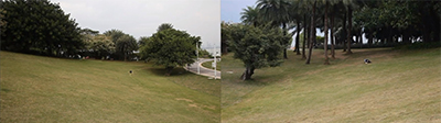 而发生在深圳湾日出剧场的《两棵树》是一个集体的行为创作,由李政德发起,我们小组中的四人都尝试了“滚草坪”这个动作,我分別从山坡的两边滚向两颗树,分享在两棵树之间飞来飞去的鸟群的快乐。