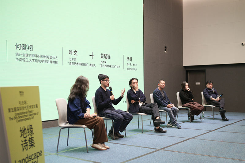 2023年11 月 18 日,第五届深圳当代艺术双年展主题沙龙“身体、行走与文化想象”在大芬美术馆一层报告厅举行。沙龙由广州美术学院艺术与人文学院教授樊林主持,并邀请陈柏麒(写作者,项目 策动者)、何健翔(源计划建筑师事务所创始合伙人,华南理工大学建筑学院讲席教授)、叶文(艺术家,“自然艺术探索计划”发起人)、黄珺瑶(艺术家,“自然艺术探索计划”成员)作为嘉宾,为现场观众呈现有关身体、行走和地方的实践经验。活动由本届双年展策展人杨勇简明开场,沙龙主持人樊林继而通过讲述自己首次来访大芬村的所见所感引入后续分享。