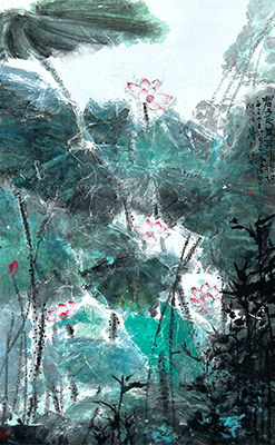 A retired official, and a member of Shenzhen Dafen Artists Association and Association of Asian Artists, Liu Mingcheng paints mainly landscapes in a contemporary freehand style that features large color masses and planarity, with figures as a supplement, to depict the good life in nature.